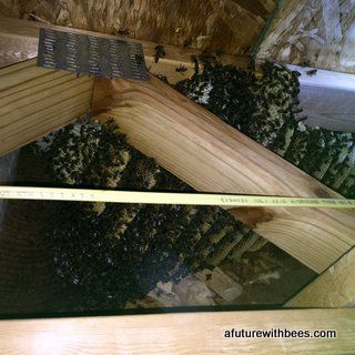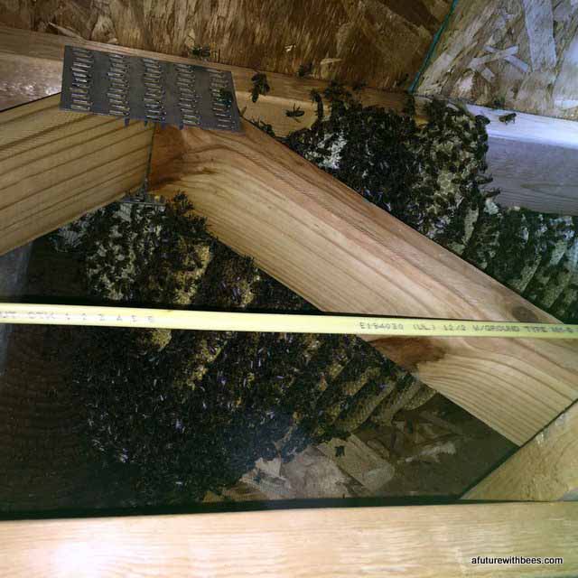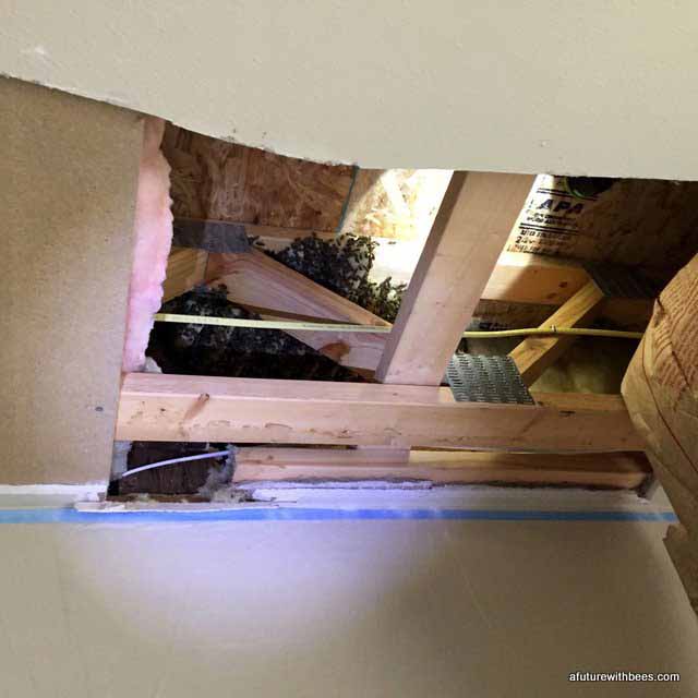 Luckily she was a local student and had just moved in so there wasn’t much to move out of the way. We are very careful to not to leave a mess or disturb the tenets any more than necessary. In this case she got some honey and was pretty happy. Then bees were in the joist space between apartments and the joists were actually open web floor trusses. This gave us room to work and rescue this young colony of bees.